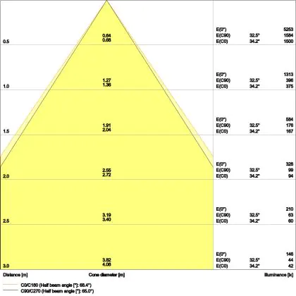 Der Abstrahlwinkel bezeichnet den Winkel, in dem das Licht aus der Lichtquelle ausgestrahlt wird. Er wird in Grad (D) angegeben. Je geringer die Gradzahl des Abstrahlwinkels ist, desto kleiner ist auch der Durchmesser des Lichtkegels, den die Lichtquelle produziert. Beispiel: Wird eine Lampe mit einem Abstrahlwinkel von 60 Grad an der Decke (2,5 m Höhe) angebracht, erzeugt sie einen Lichtkegel von 2,9 Metern Durchmesser. Hat die Lampe hingegen einen Abstrahlwinkel von 120 Grad, beträgt der Lichtkegel 8,7 Meter im Durchmesser. |