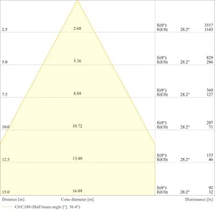 Der Abstrahlwinkel bezeichnet den Winkel, in dem das Licht aus der Lichtquelle ausgestrahlt wird. Er wird in Grad (D) angegeben. Je geringer die Gradzahl des Abstrahlwinkels ist, desto kleiner ist auch der Durchmesser des Lichtkegels, den die Lichtquelle produziert. Beispiel: Wird eine Lampe mit einem Abstrahlwinkel von 60 Grad an der Decke (2,5 m Höhe) angebracht, erzeugt sie einen Lichtkegel von 2,9 Metern Durchmesser. Hat die Lampe hingegen einen Abstrahlwinkel von 120 Grad, beträgt der Lichtkegel 8,7 Meter im Durchmesser. |